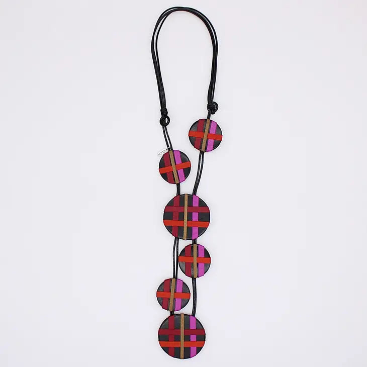 You are sure to stand out when wearing this unique necklace. Black circle discs wrapped with shades of fuchsia and red ribbon on an adjustable wax black cord. The elongated look of this lightweight statement necklace is a result of the cascading circles creating a flattering and unique silhouette.