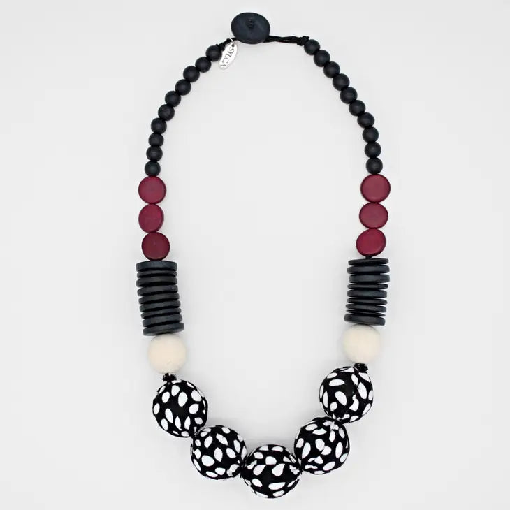 Introducing the Imani Necklace from Sylca Designs – a refined statement piece that’s sure to have all eyes on you! This artful, black and burgundy design features painted and fabric-covered beads, which are strung with a black clasp closure. It’s sure to bring a luxurious, elegant touch to all your favorite necklines and looks. Celebrate your unique style and wear your own Imani necklace with pride!