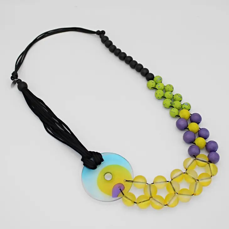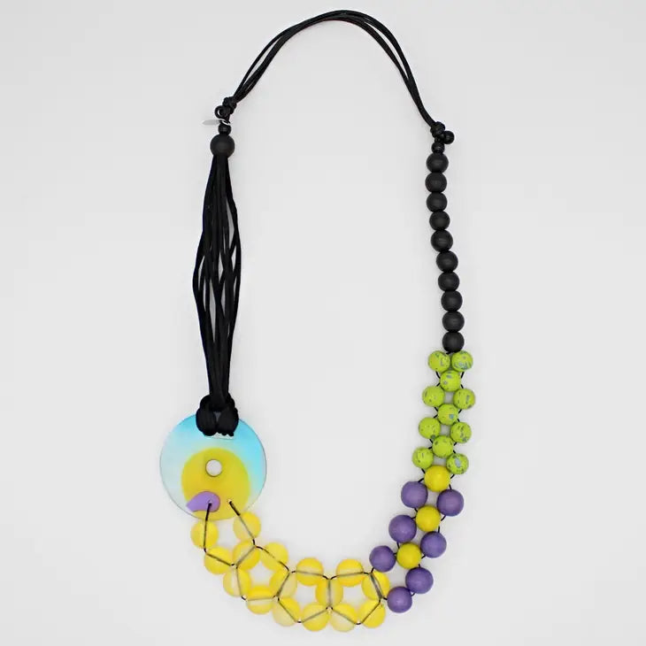 Add a creative and stylish touch to your wardrobe with our Bold Belinda Necklace in shades of lime, blue and yellow. This statement piece will generate compliments as you enter a room or your zoom conference. Resin and wooden beads in mixed media accented by a variety of strung wax cords create the unique look of what could be the wearer’s signature necklace.