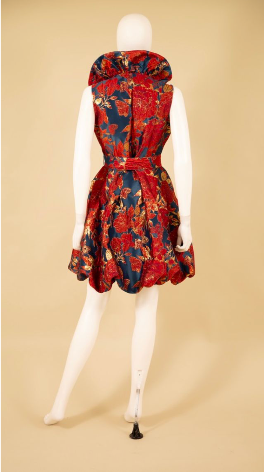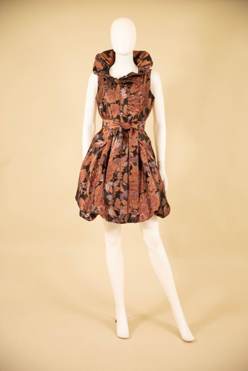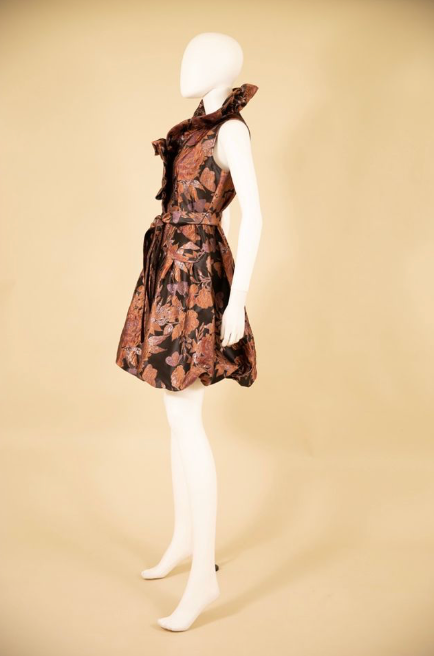 Yarn dyed brocade bubble dress with wired ruffle neck
