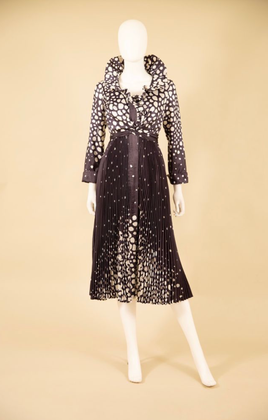 Print duppioni A-line dress with 3D pleats and ruffle collar, self-belt  in beige/black