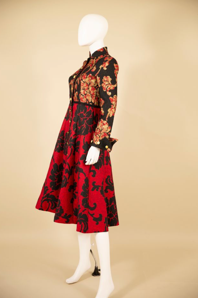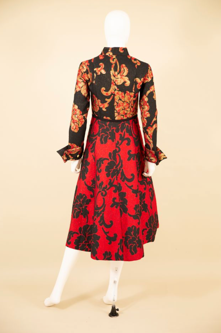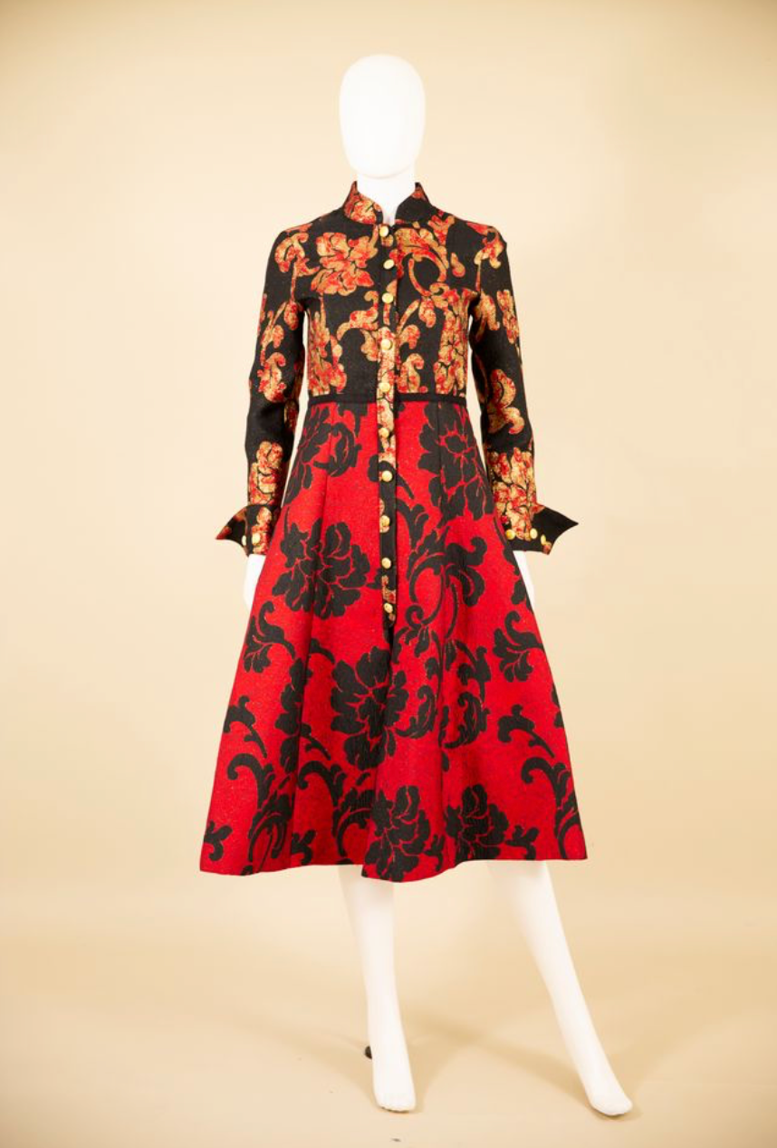 Fitted brocade coat/dress with removable cuffs, front zipper closure, and decorative buttons