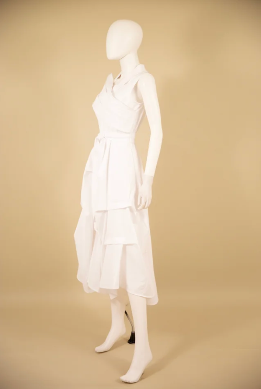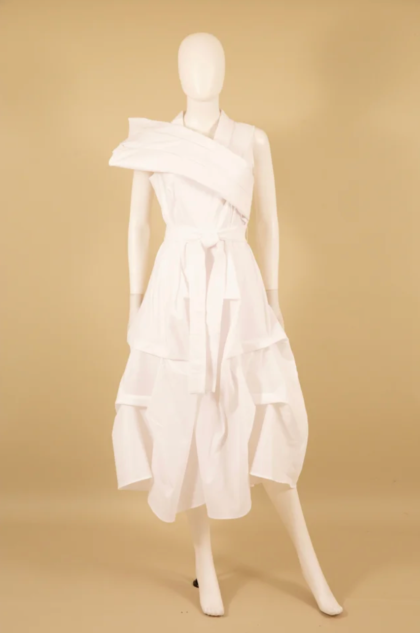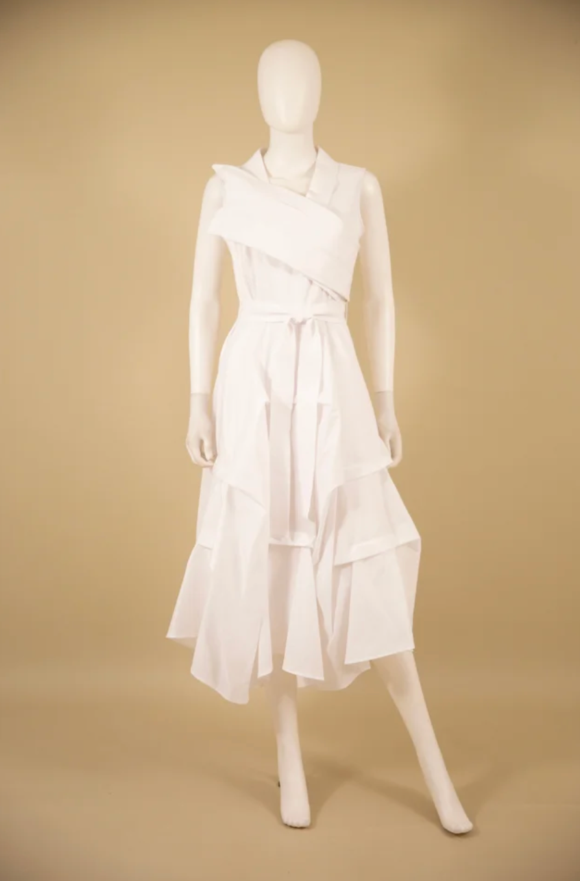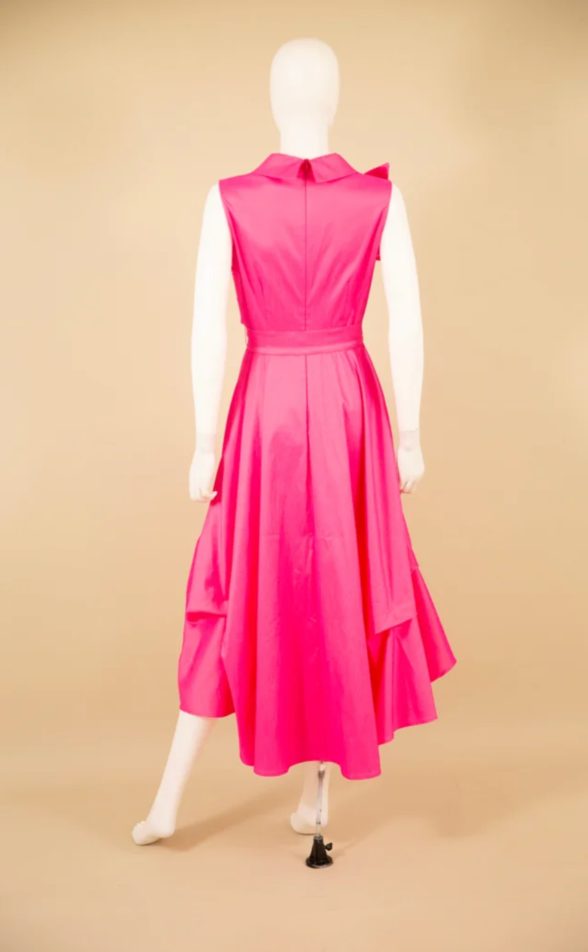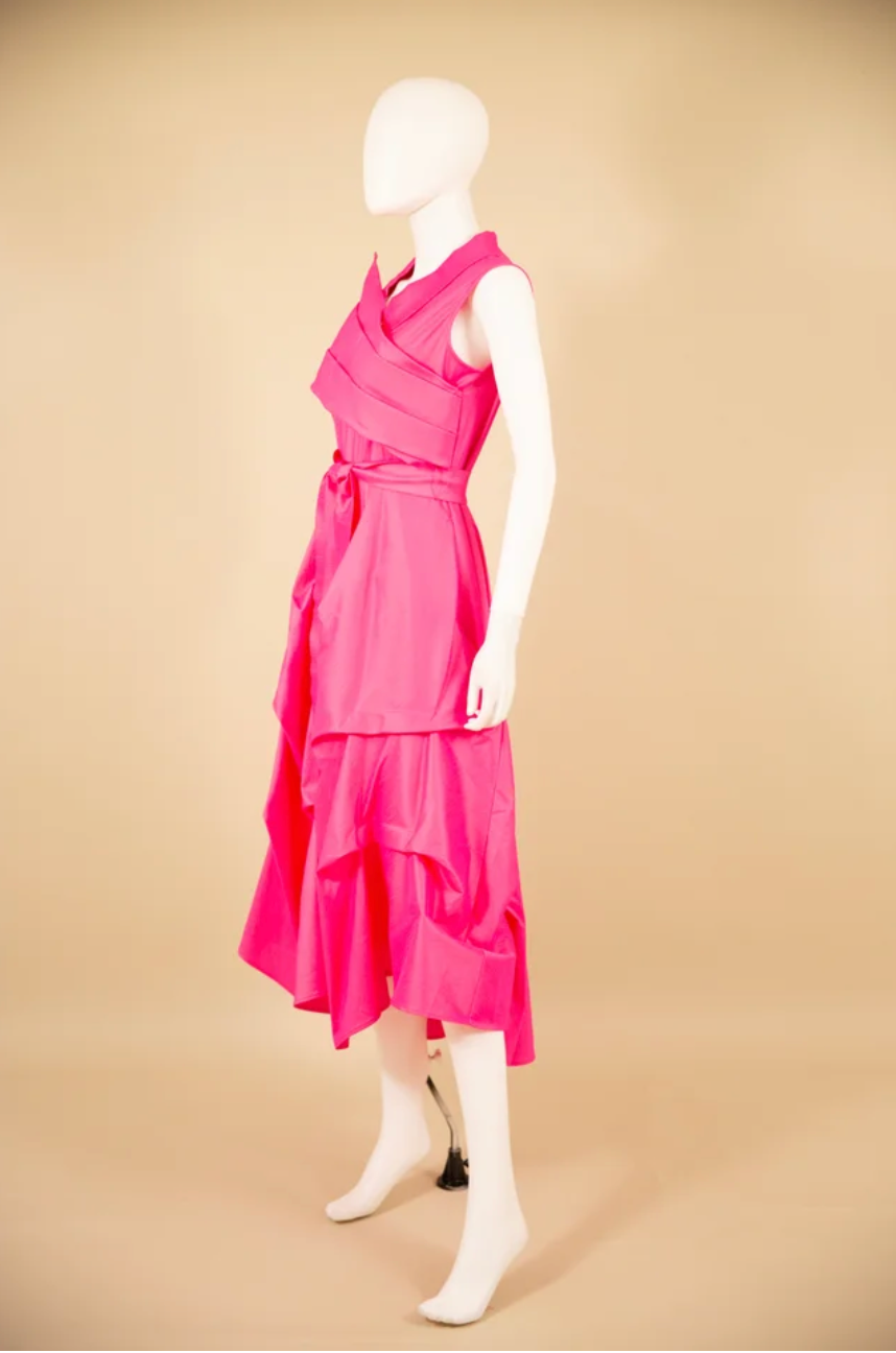 Stretch duppioni flag dress with pleated front bottom and zip back