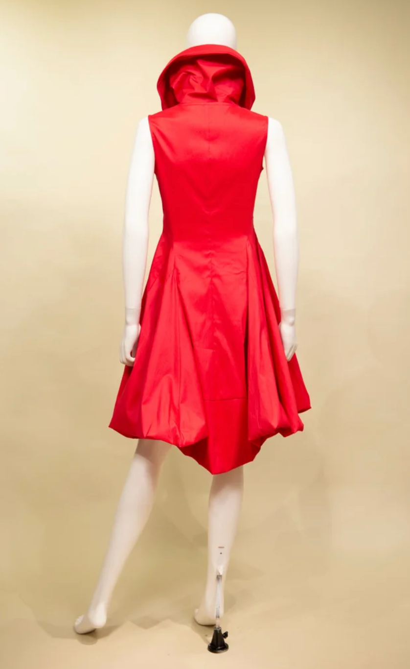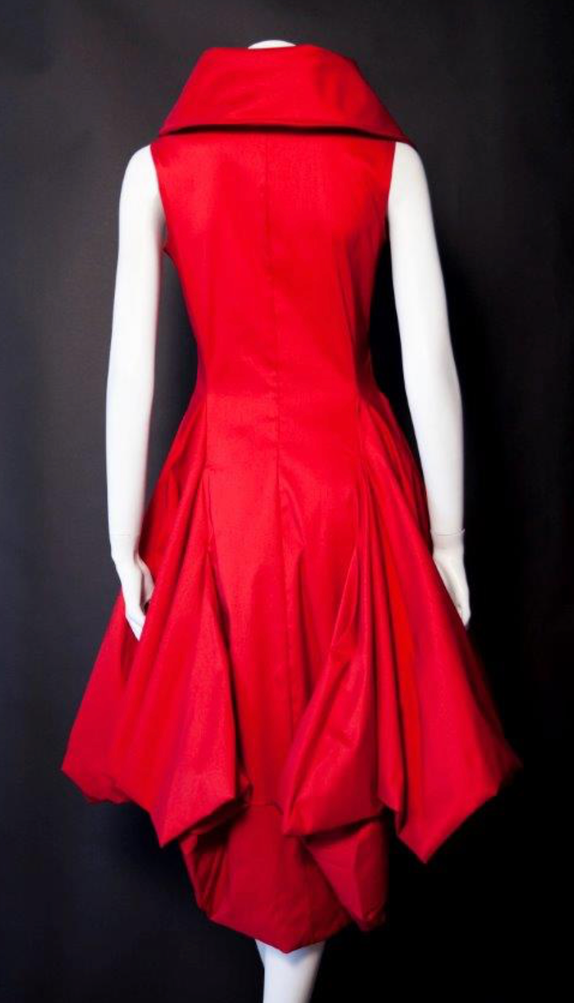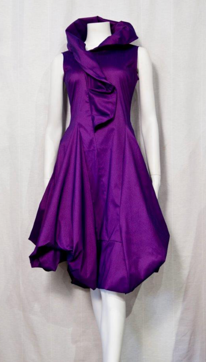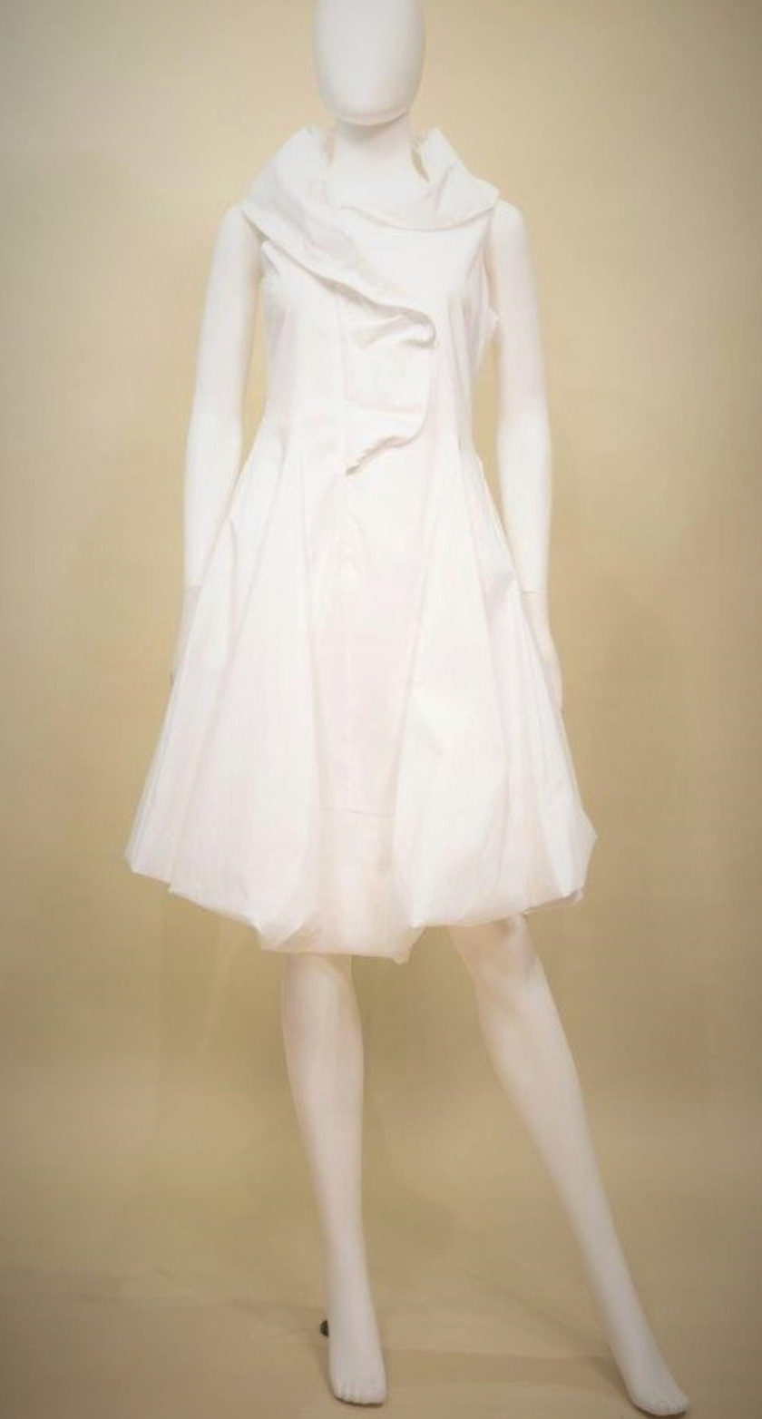 Water resistant stretch dupioni bubble dress with SD logo collar. Front Hidden zipper closure, side pockets with hidden zipper.