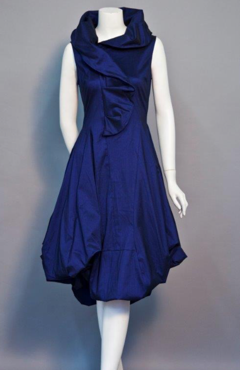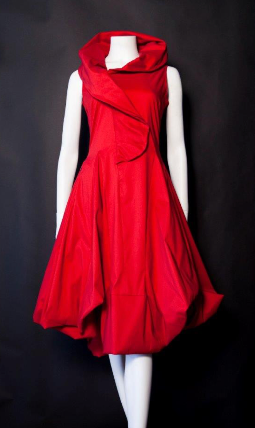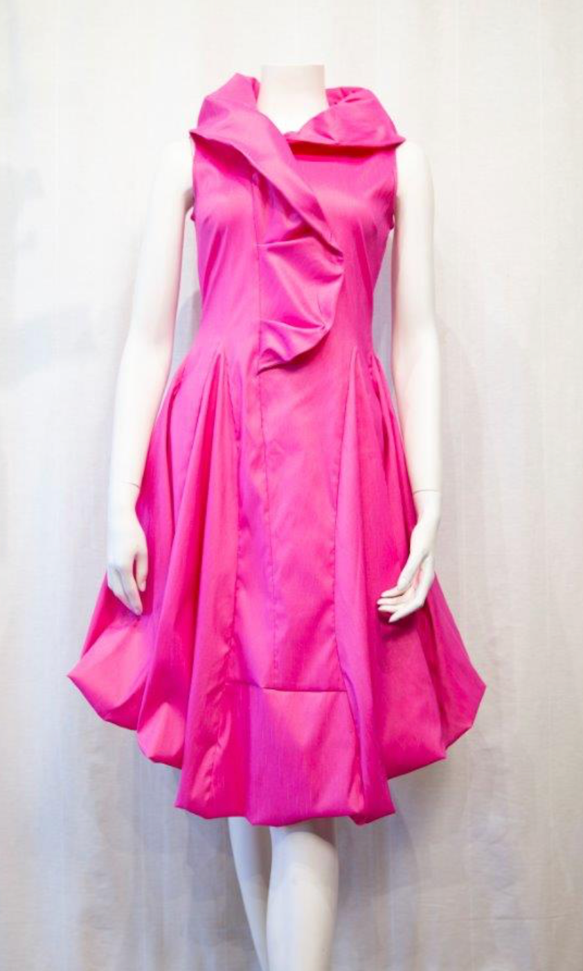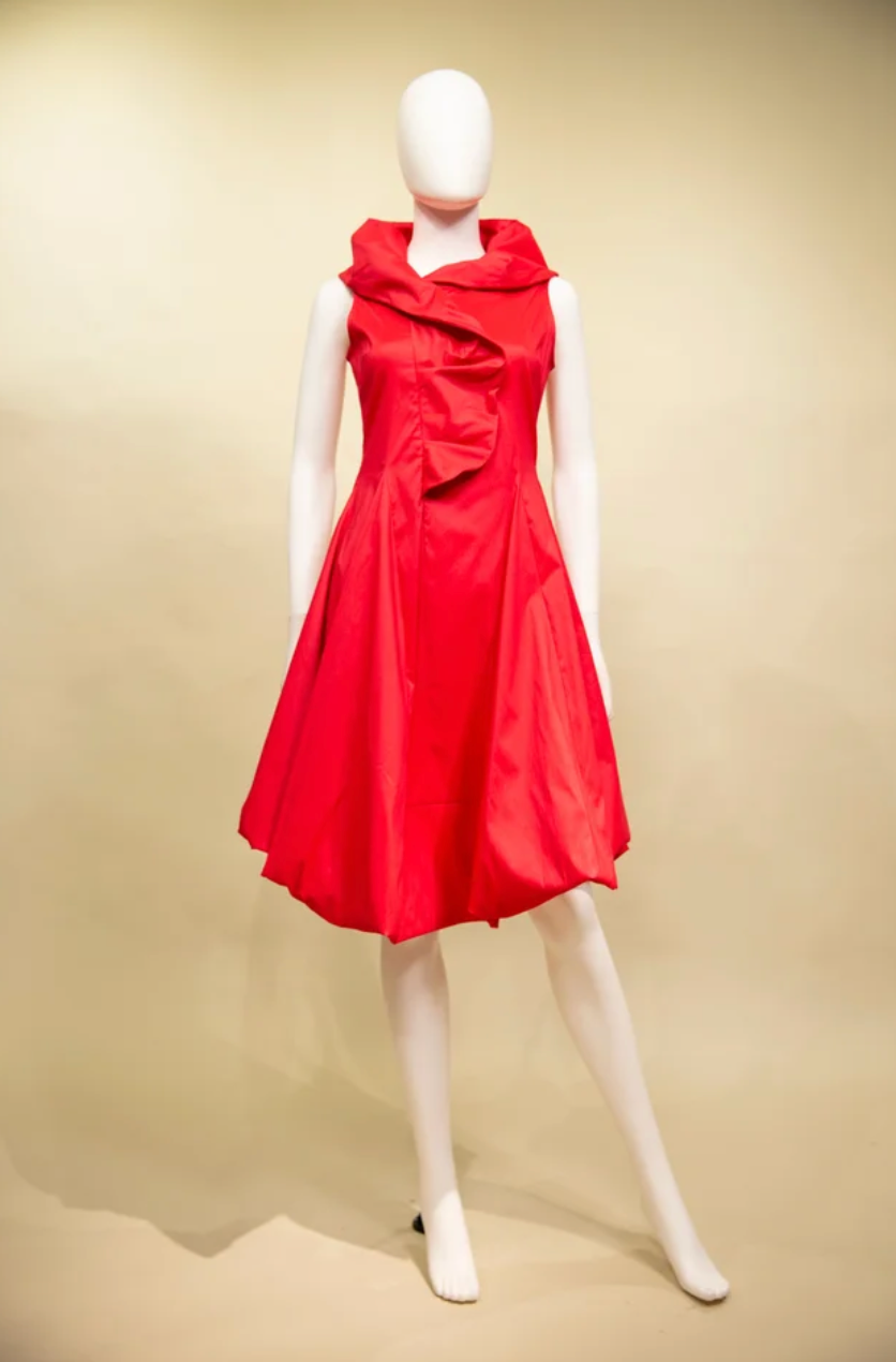 Water resistant stretch dupioni bubble dress with SD logo collar. Front Hidden zipper closure, side pockets with hidden zipper.