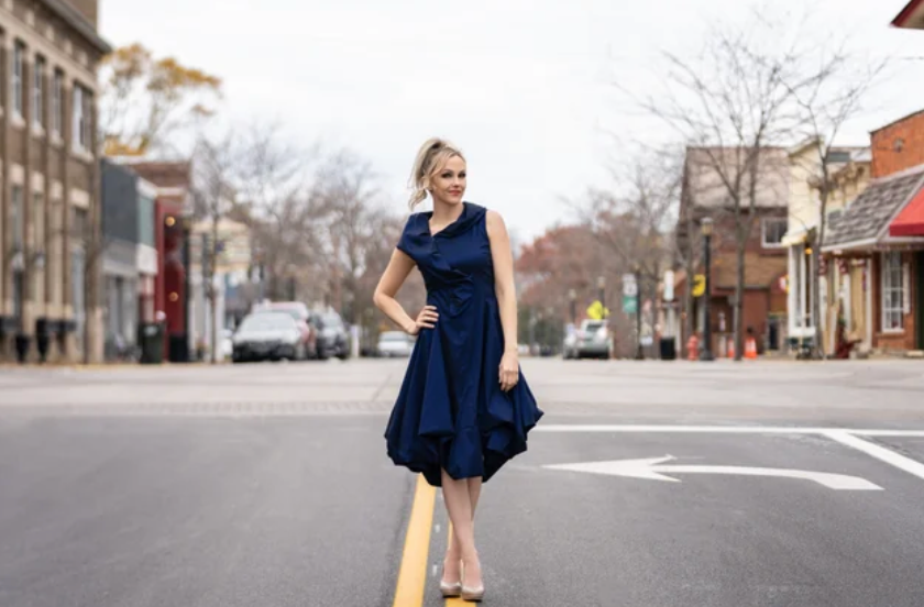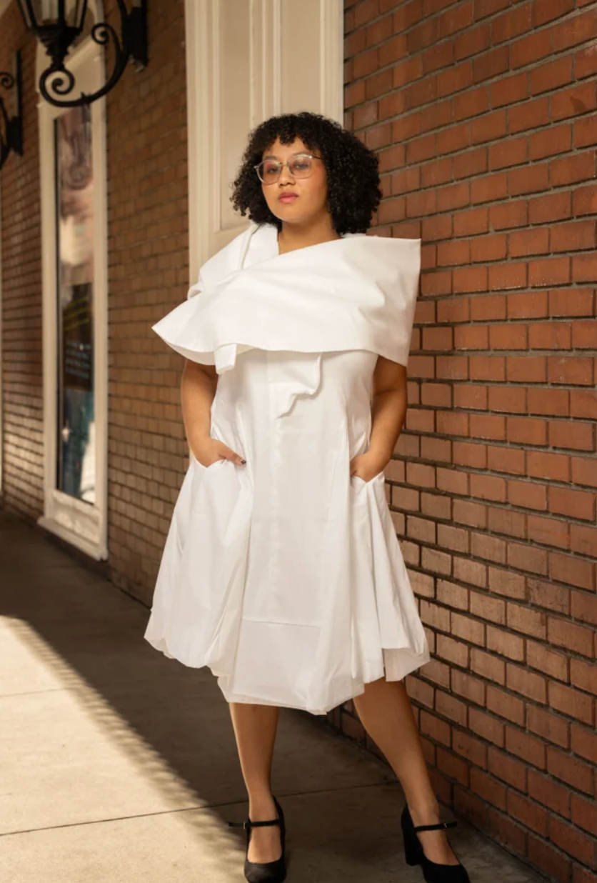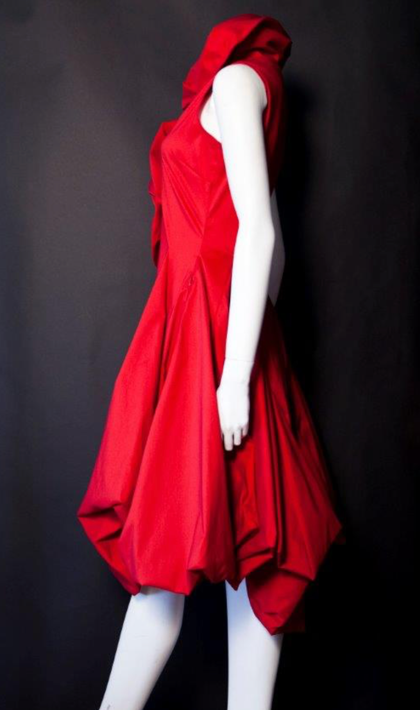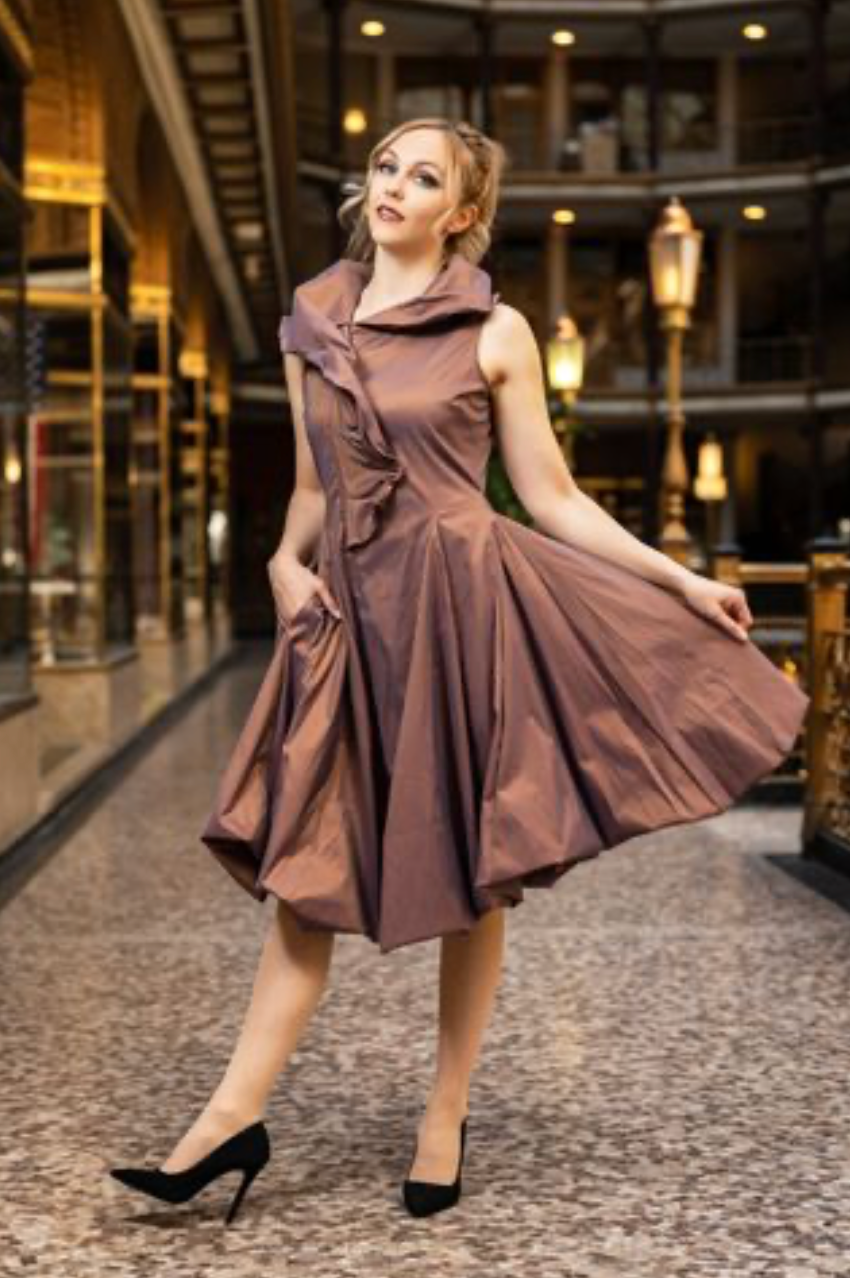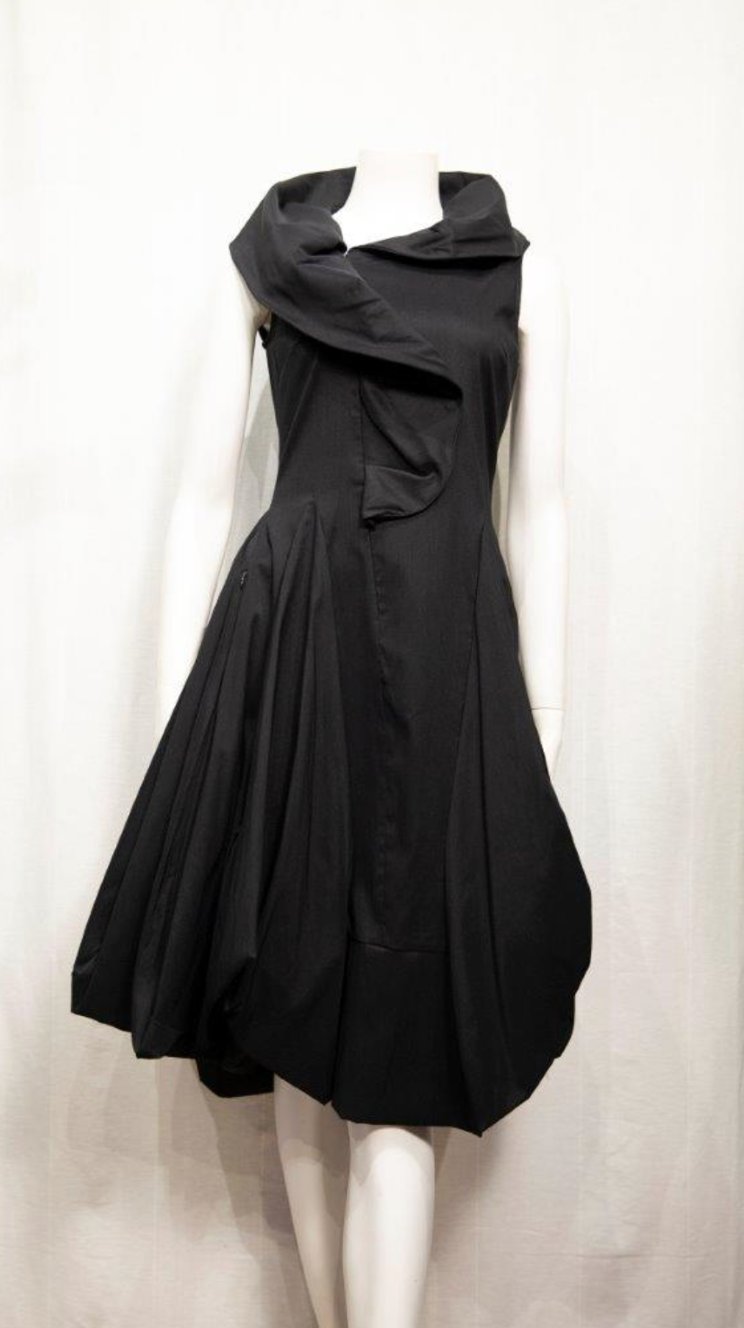 Water resistant stretch dupioni bubble dress with SD logo collar. Front Hidden zipper closure, side pockets with hidden zipper.
